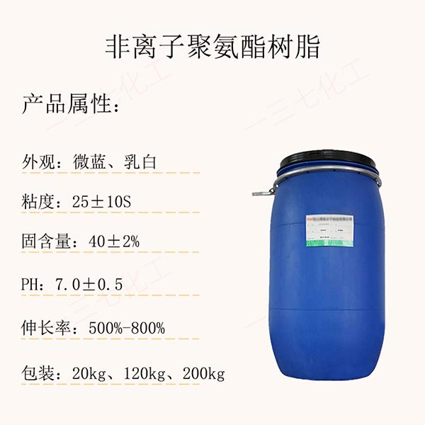 不同與陰離子和陽(yáng)離子聚氨酯樹(shù)脂,采用非離子形態(tài)聚氨酯樹(shù)脂,具體環(huán)保特性,良好的水洗牢度,耐水性好,附著力好,斷裂強(qiáng)度大;常溫低溫,耐曲折性能好,透明度高。